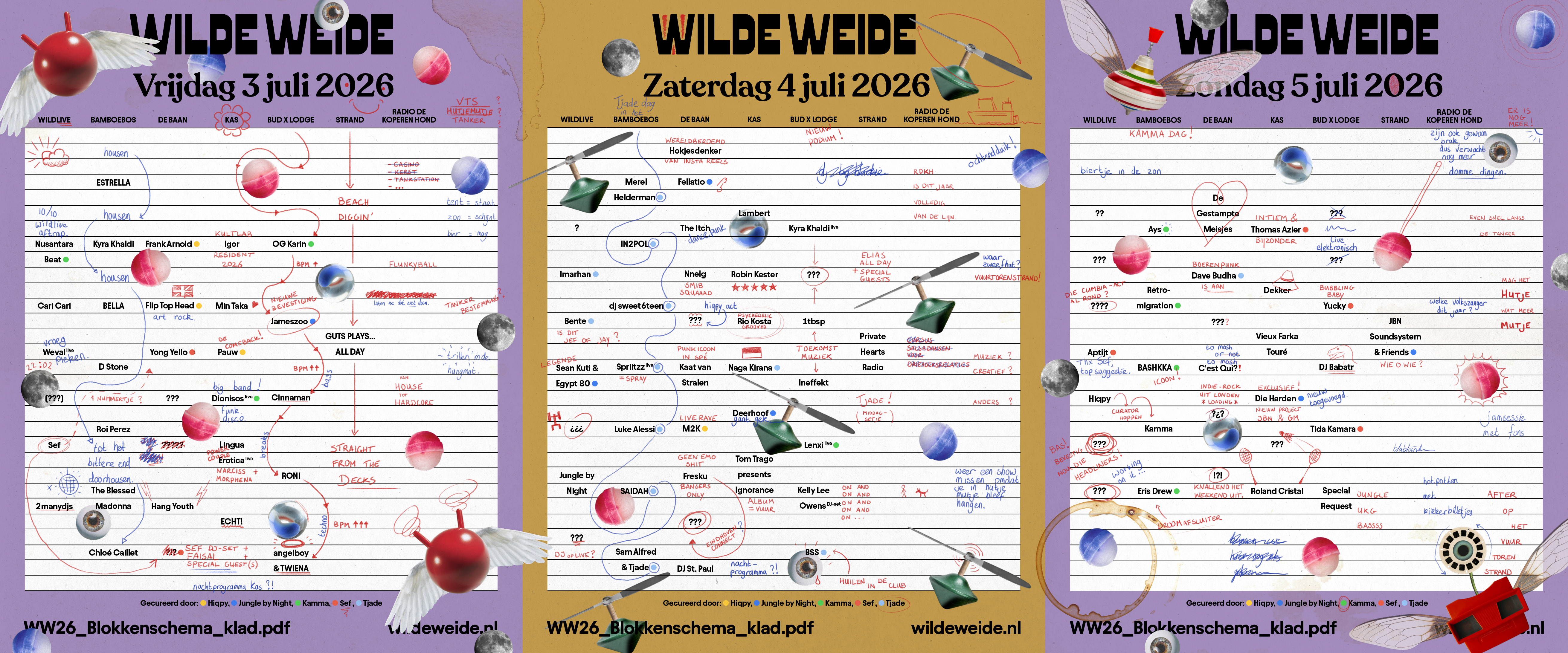 In een week vol boekjes die open gaan nemen we jullie ook graag mee in het creatieve proces. Zie hier de kladversie van het blokkenschema om jouw wilde weekend vorm te geven. Een aantal dingen moeten nog ingevuld of vastgezet worden, maar er vallen al genoeg routes uit te stippelen, plannen te maken en acts te verkennen.